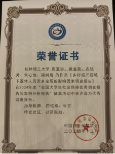 在此次活动中,太阳成集团tyc151cc社会工作专业田钰燕老师、朱京老师指导,学生周夏宇、黄春荣、农铭秀、何心怡、梁树妮的作品《乡村振兴视域下退休人员回乡定居的影响因素调查报告》获得优秀调查报告(不分等级)。