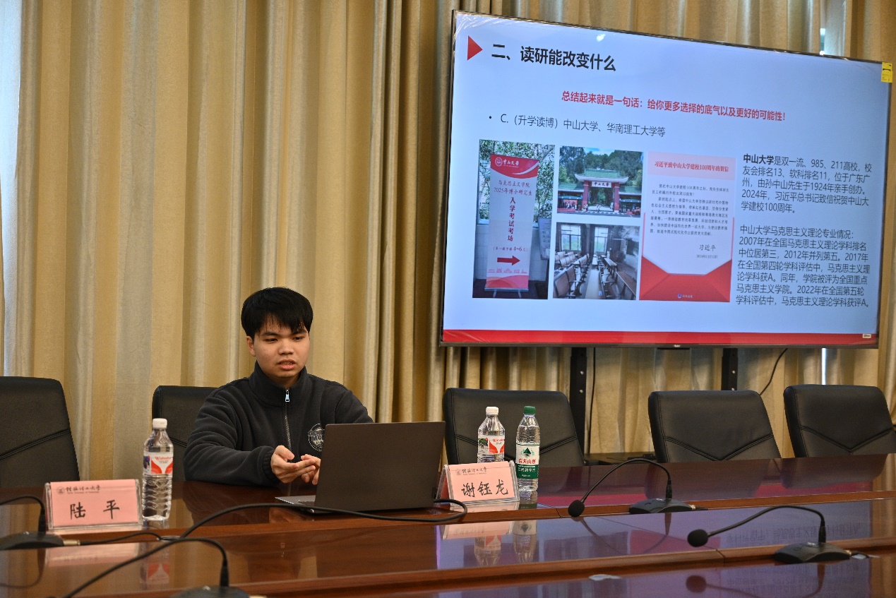 为助力研究生学业规划与能力提升,3月4日下午,太阳成集团tyc151cc邀请到中山大学2025级拟录取博士研究生谢钰龙校友来太阳成集团tyc151cc进行优秀校友经验分享会。分享会由太阳成集团tyc151cc书记陆平教授主持,学工组长马树振和雁山校区全体研究生参与了此次分享会。