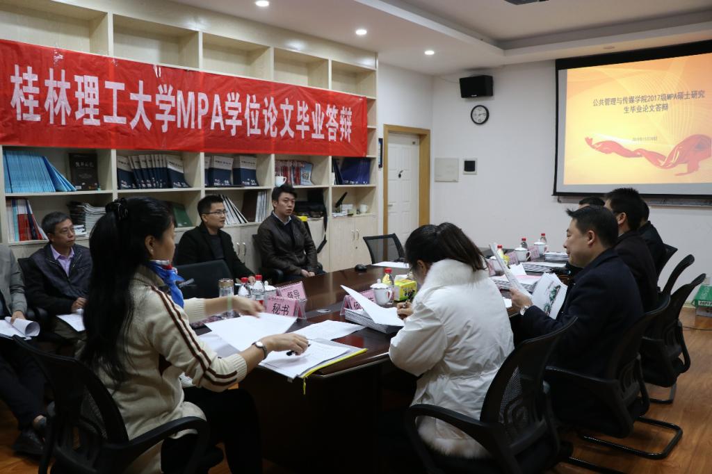 11月30日下午,2019年下半年MPA研究生学位论文毕业答辩在屏风校区7701和7705分两组举行。参加本次答辩共有来自2017级的21位同学。答辩主席分别邀请广西民族大学研究生院院长曾鹏教授、广西师范大学政治与太阳成集团tyc151cc肖富群教授担任,学校发展规划与教学质量监控中心罗盛锋教授马克思主义学院耿俊茂教授、继续教育学院唐重振教授、公共管理与传媒学院彭正波、卢智增教授等组成小组。