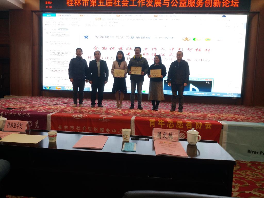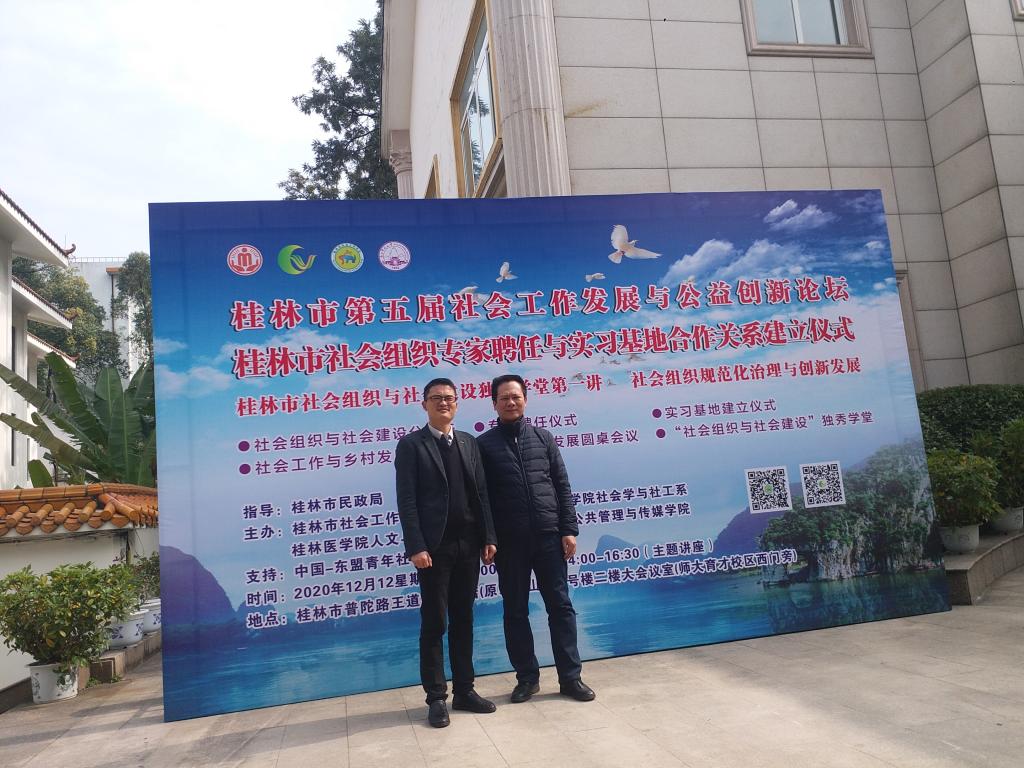 2020年12月12日,在广西师范大学育才校区举行了桂林市第五届社会工作发展与公益创新论坛。本次活动由桂林市民政局指导,桂林市社工协会、桂林理工大学公共管理与传媒学院社会工作教研室、桂林医学院人文与管理学院社会工作教研室主办。中国-东盟青年社会组织发展研究院支持。太阳成集团tyc151cc社会工作教研室刘成晨老师和朱京老师,及部分社会工作专业的同学参加了本次活动。