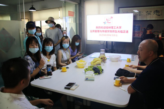 公司创始人及负责人刘亚东热情接待了老师和同学们。应老师和同学们的热烈要求,刘亚东谈起自己创业史:他是桂林理工大学的毕业生,2013年创业热潮奔涌而来,仔细盘算了自己毕业之后的人生规划后,他下定决心为自己“造饭碗”。回忆起在公司打地铺的日子,除了有自己不灭的信念,还有不离不弃支持他走下去的创业导师们,当然也离不开国家政策和桂林理工大学创新创业孵化基地强大的保障措施。其创业及工作具体案例,让同学们对活动策划执行、品牌运营等实践工作有了更深刻具体的认识。刘亚东表示,公司积极为在校学生提供实习岗位,期待更多学生通过实习夯实专业知识,提升专业技能。