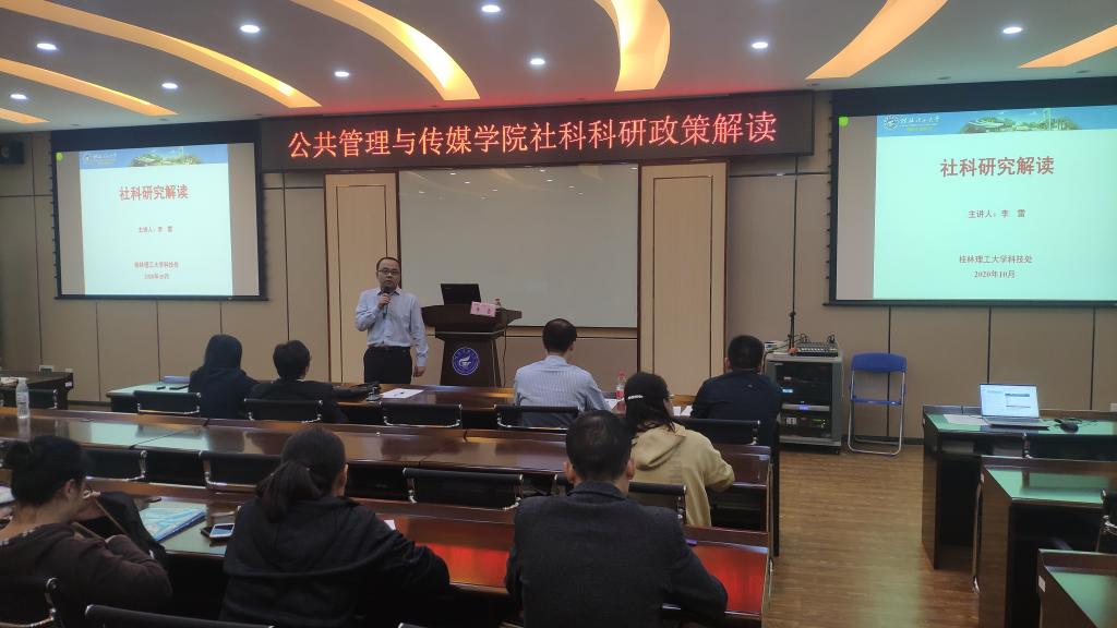为提升学院广大科研工作者工作实效,回答学院教职工科研工作中存在的政策疑惑,2020年10月29日,学院在屏风校区07106教室举办了主题为“社科政策研究解读”的讲座,学校科技处处长李雷教授应邀主讲,学院全体教职工参加了本次讲座,讲座由学院院长彭正波主持。