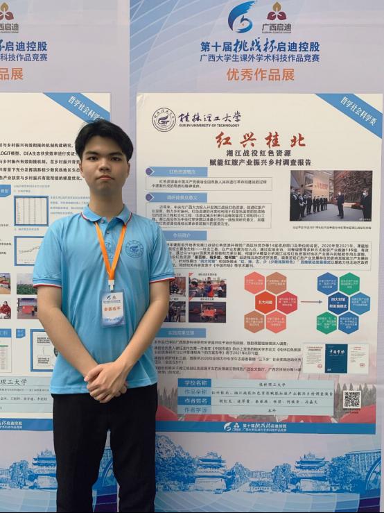 心中有梦,不惧风雨。在各个方面他都追求卓越、敢为人先。先后担任桂林理工大学公共管理与传媒学院行政管理协会会长、院学生会学习部副部长、院团委学生副书记;作为学生干部尽职尽责,连续两年获评“桂林理工大学优秀学生干部”;大学期间综测排名专业第一,发表学术论文2篇:《养老院里的生命伦理困境与系统视角下的社工介入——基于G市的个案调查》《桂林红色旅游业的发展研究与公共管理视角下的方案思考》;作为项目负责人曾获第十七届“挑战杯”全国大学生课外学术科技作品竞赛三等奖、第十届“挑战杯”广西大学生课外学术科技作品竞赛特等奖、第六届中国国际“互联网+”大学生创新创业大赛广西赛区选拔赛金奖、第九届“挑战杯”广西大学生创业计划竞赛银奖等;曾受聘为“桂林理工大学第十二届优秀学生报告团成员”;曾获“桂林理工大学学生课外科技创新先进个人”等多类奖项;曾获国家奖学金1次、自治区政府奖学金1次、校级奖学金3次、周大福奖学金1次;现已被推免至东北大学攻读硕士研究生。