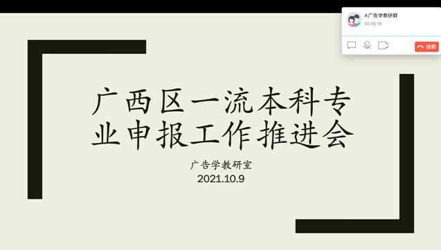 2021年10月9日,广告学教研室通过网络会议平台,针对广告学专业申报广西区一流专业工作进行了集体讨论会。学院副院长何德珍教授出席会议并发言,教研室主任张希蕾老师主持并记录会议,教研室全体老师参加。