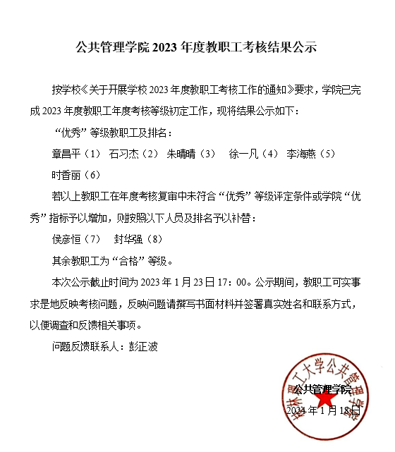 太阳成集团tyc151cc2023年度教职工考核结果公示
