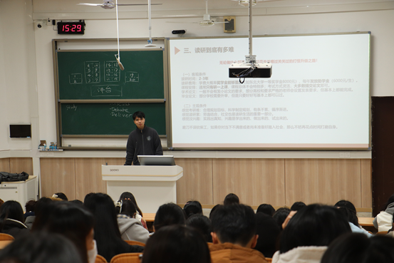 活动伊始,谢钰龙校友首先回忆了他在学院就读行政管理专业的4年时光,并向老师们的悉心栽培表示衷心地感谢。随后以题为《读研之路 行则必达——浅谈读研的必要、作用、难度》与学生分享交流。介绍自己在学院四年的成长成才经历、在东北大学读研的锐变以及职业发展及学业规划等,鼓励同学们要持续学习与适应变化的重要性,积极探索兴趣领域,勇于尝试,为未来的职业规划与学业规划早做准备。