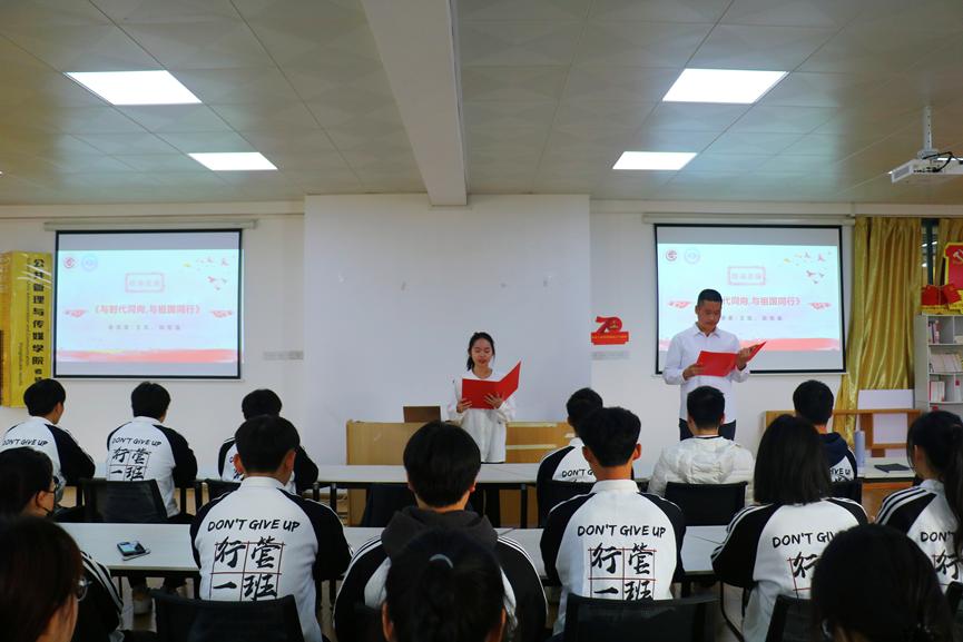 学生代表王凯、陆铭晶以饱满的精神、激昂的语言、真挚的情感进行了诗词朗诵表演,回顾了党的百年之路,讴歌了党的丰功伟绩,表达了对党的崇敬意,生动展示当代大学生朝气满怀的精神风貌。