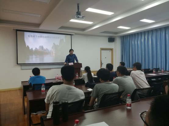 此次论坛由三个部分组成。首先由我校管理学院李娟、人文学院庞基展、陈嘉浩、李洪涛四位同学围绕“新常态下中国经济增长和制度建设”的主题分别做题为《物流物业协同驱动的快递服务云模式》、《小区开放对社区治理的影响—基于网络民意表达的研究》、《中国“时空修复”语境下城市群空间生产转型研究》和《行政区划与国家经济社会发展》的汇报。第二部分的自由提问和讨论环节,大家踊跃发言,纷纷对汇报人的论文提出自己的疑问和想法,并以当前时事热点“雄安新区”的设立和精准扶贫等问题进行探讨,讨论气氛活跃。最后,向俊杰副教授对四位汇报人的论文表达赞赏,并结合自己的专业角度提出了一些意见和建议,同时对此次学术论坛的举办表示肯定,鼓励大家在研究生期间多举办学术性的交流活动,互相学习、共同进步。