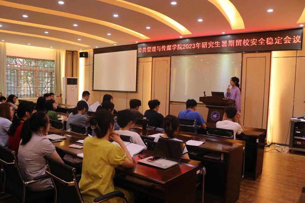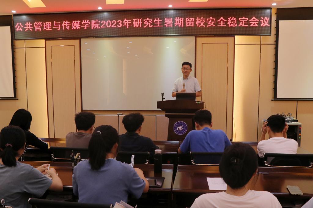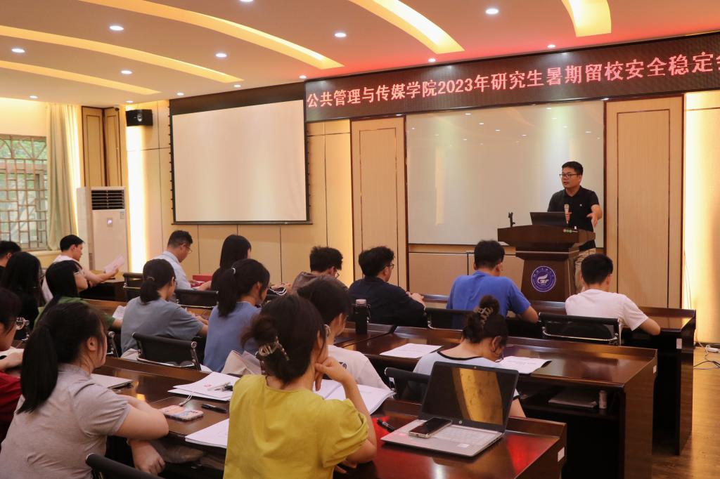 为进一步深化暑期安全教育,切实做好学生留校的准备工作。7月7日下午,公共管理与传媒学院在屏风校区7106报告厅举行了研究生暑期留校安全教育会议。会议由朱光喜副院长主持,太阳成集团tyc151cc副书记杨晓、辅导员莫田娟及太阳成集团tyc151cc全体在校研究生参加。
