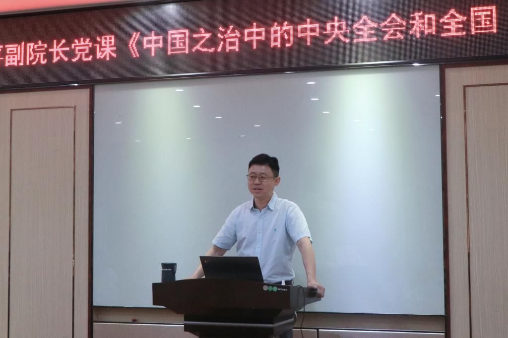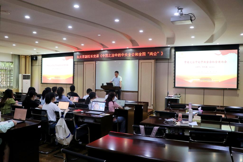 朱光喜副院长通过回顾建党一百多年的光辉历程和伟大成就,具体阐述了“中国之治”的意义和中国特色社会主义的制度优势。接着,朱光喜副院长分别从党的中央全会及其议程运行规律、全国人大(常委会)及其议程运行规律、政协全国委员会及其议程运行规律、党的中央全会议程与全国“两会”的议程关系四个方面对《中国之治中的中央全会和全国“两会”》专题党课进行详细讲解。最后,朱光喜副院长激励同学们团结拼搏、努力奋斗,不断增强“四个意识”,坚定“四个自信”,为实现中华民族伟大复兴的中国梦不断奋斗。