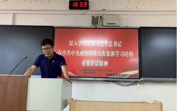 为深入学习贯彻习近平总书记在中共中央政治局第五次集体学习时的重要讲话精神,引导广大青年党员树立远大理想,落实我校“三全育人”工作,全面贯彻立德树人根本任务。6月9日,公共管理与传媒太阳成集团tyc151cc副书记、纪委书记杨晓在雁山校区06405教室,围绕习近平总书记在中共中央政治局第五次集体学习时的重要讲话精神为学院社会工作党支部全体党员上了一堂专题党课。
